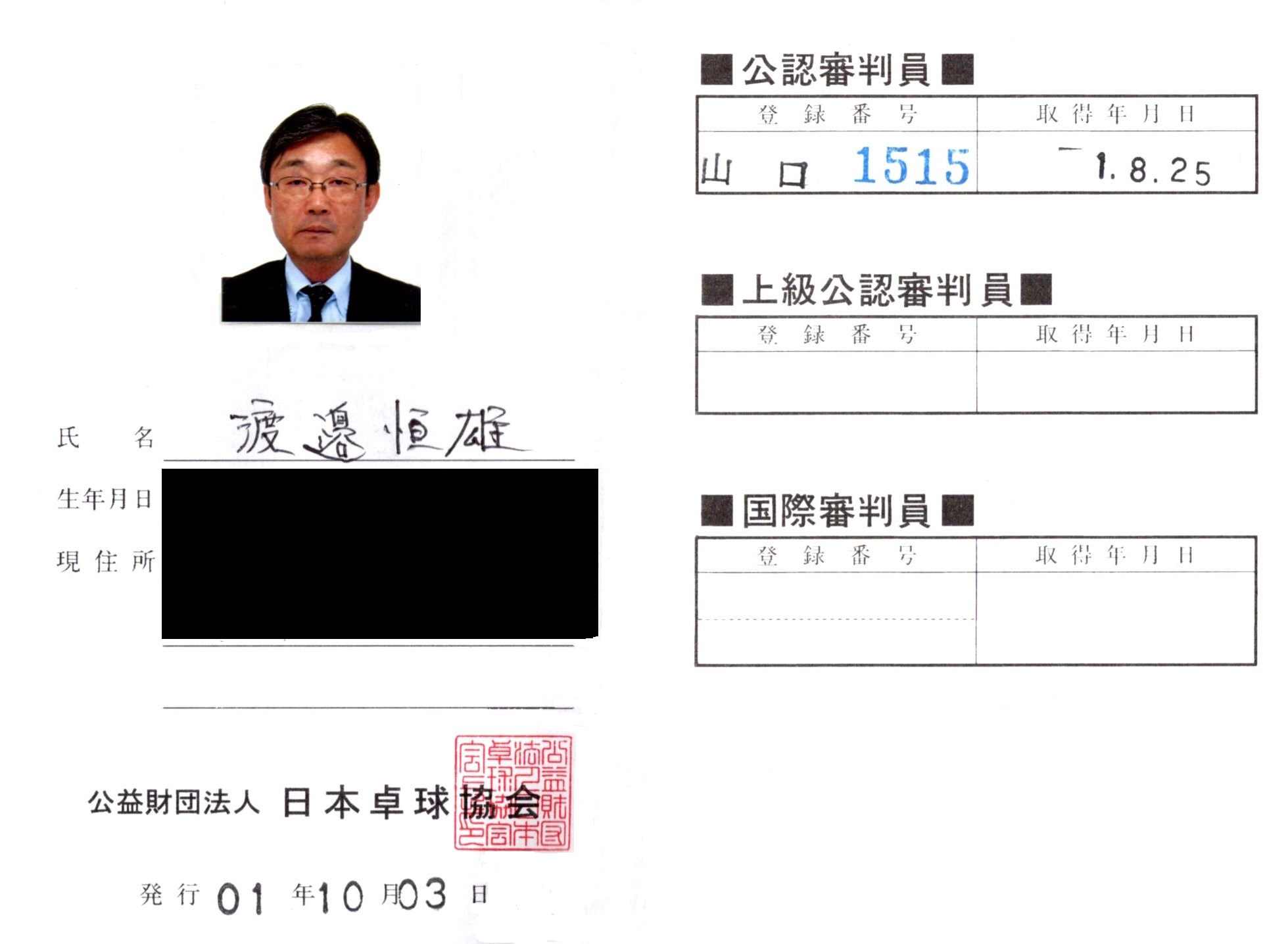 | 渡邉 恒雄 | 山口1515 | 令和 1 年 8月25日 | |